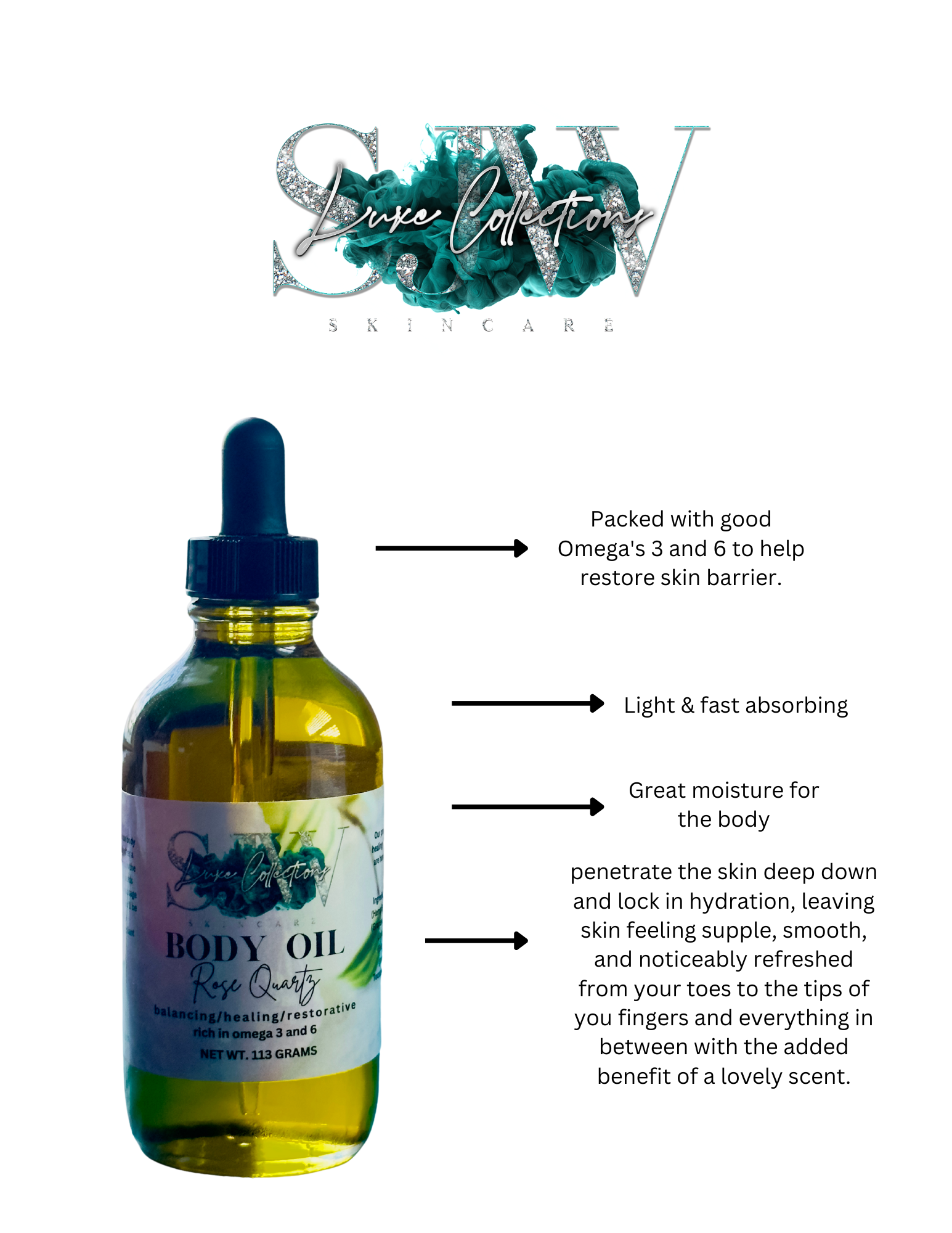 Glow with elegance and grace with Rose Quartz Luxury Body Oil, a luminous blend inspired by the timeless beauty of the rose—reimagined with a modern, citrusy twist.